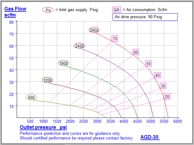 - Boost 35.6 SCFM Gas from 2850 psi to 4200 psi while using 40 SCFM Air @ 90 psig supply pressure