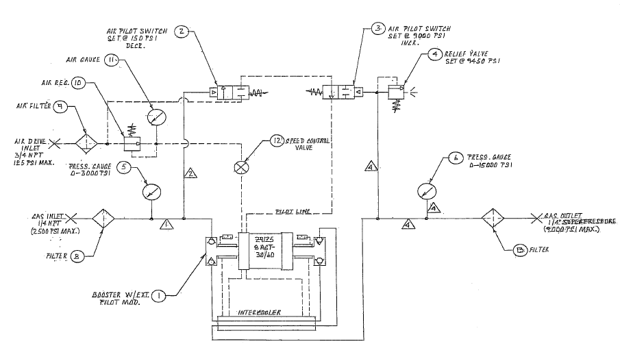 - Air-driven gas booster with external pilot modification to enable use of external air pilot switches to automatically start and stop the booster.
