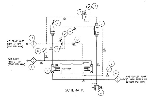 The Haskel model 80508 type AGD-152 Gas Booster System utilizes air pressure to boost gas pressures to a maximum of 25,000 psi.