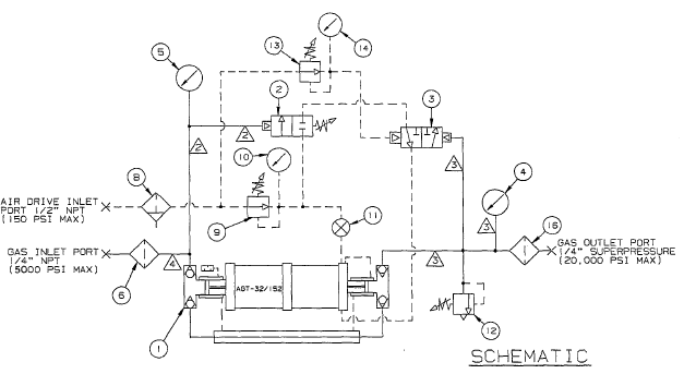 - Air-driven gas booster with external pilot modification to enable use of external air pilot switches to automatically start and stop the booster.