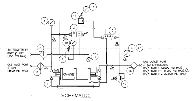 - Boost 4.6 SCFM Gas from 1400 psi to 15000 psi while using 35 SCFM Air @ 90 psig supply pressure