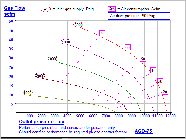 - Boost 14.3 SCFM Gas from 3000 psi to 8000 psi while using 45 SCFM Air @ 90 psig supply pressure