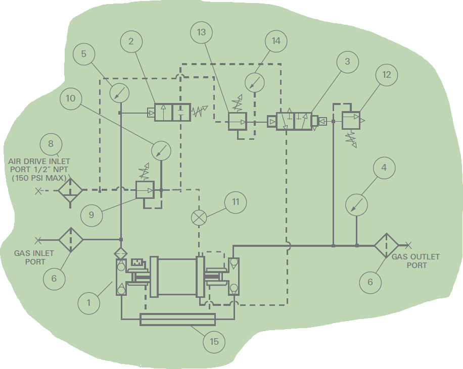 - Air-driven gas booster with external pilot modification to enable use of external air pilot switches to automatically start and stop the booster.