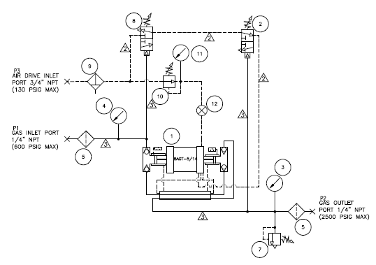- Air-driven gas booster with external pilot modification to enable use of external air pilot switches to automatically start and stop the booster.
